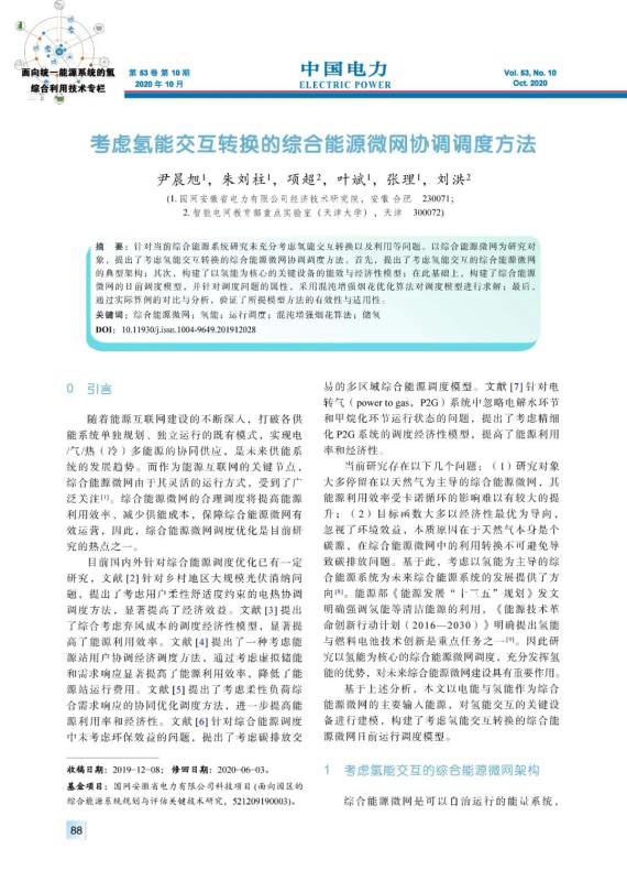 尹晨旭, 朱劉柱, 項(xiàng)超, 等. 考慮氫能交互轉(zhuǎn)換的綜合能源微網(wǎng)協(xié)調(diào)調(diào)度方法[J]. 中國(guó)電力, 2020, 53(10): 88-95, 148.
