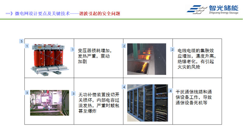 十幾年來我基本都是從事電力電子相關(guān)的工作,我們看到的風(fēng)機(jī)、光伏,實(shí)際上很多是大功率的電力電子逆變器,對于負(fù)載來說,包括很多的電源也是電力電子的負(fù)載,包括通訊基站、服務(wù)器和辦公設(shè)備,包括變頻器、軟起動(dòng)器,這些都是電力電子的負(fù)載,一邊是電源,一邊是負(fù)荷,包括微電網(wǎng)里使用的空調(diào),很多的空調(diào)使用的是變頻空調(diào),這個(gè)是小的家用的空調(diào),還有一些LED照明燈,這些都會(huì)對電網(wǎng)產(chǎn)生很大的諧波污染,最終的結(jié)果是圖上左邊是基波波形,各種負(fù)載加進(jìn)去以后導(dǎo)致電源發(fā)生很多的畸變產(chǎn)生很多奇次諧波,會(huì)導(dǎo)致電能質(zhì)量非常差,這種特別差的電源對微電網(wǎng)造成很大的安全隱患。比如諧波會(huì)使變壓器的損耗增加,發(fā)熱嚴(yán)重,震動(dòng)加劇,壽命減少;會(huì)使電線電纜的集膚效應(yīng)增加,溫度升高,絕緣老化,有引起火災(zāi)的風(fēng)險(xiǎn);會(huì)使無功補(bǔ)償裝置投切開關(guān)損壞,內(nèi)部電容過熱發(fā)熱,嚴(yán)重時(shí)鼓包甚至引起爆炸,對微電網(wǎng)的運(yùn)行造成很大的影響;會(huì)直接或間接影響微電網(wǎng)內(nèi)部通信設(shè)備、服務(wù)器等的正常工作,導(dǎo)致通信線路和設(shè)備工作異常、宕機(jī)、停機(jī)。這些都是諧波對微電網(wǎng)帶來的危險(xiǎn),應(yīng)該引起我們的高度重視,在設(shè)計(jì)階段盡量避免。