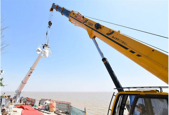 4月15日,500余噸水泥基礎平臺安全澆筑完成,進入養(yǎng)護期。項目經(jīng)理岳付昌介紹說:“風機的架設是我們整個工程建設的關鍵點和難點。開山島地處黃海前哨,島上怪石嶙峋,施工環(huán)境既復雜又惡劣,給我們工程設計和施工帶來了很多困難。在這種惡劣環(huán)境下將500多噸水泥成功澆筑,既是全體施工人員學習傳承時代楷模精神的最佳實踐,也為未來的海島微電網(wǎng)建設提供了重要示范。” 水泥基礎平臺養(yǎng)護期結(jié)束后,國網(wǎng)江蘇電力開始風力發(fā)電機組建工作。