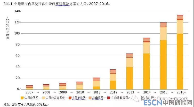 成本大幅降低,技術進步和相關支持政策的出臺推動了全球范圍內離網可再生能源技術的應用? 據國際可再生能源署統(tǒng)計,2016年全球約有1.33億人口享受離網技術提供的服務,至少900萬人口接入到可再生能源微網中,1.24億人口使用太陽能照明解決方案和太陽能家庭系統(tǒng)?(圖 1.1)