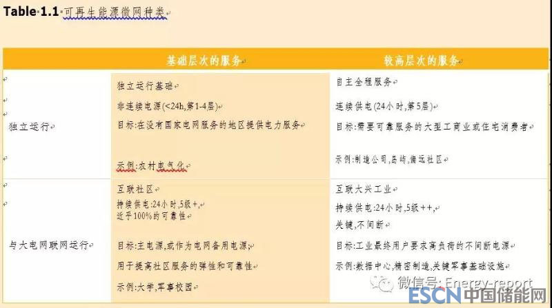 可再生能源微網利用技術來駕馭太陽能,水電,生物質能,風能和/或混合能源(后者能夠利用儲能或例如柴油發(fā)電廠)。 它們的容量從低于1千瓦(kW)到10兆瓦(MW)不等(IRENA,2016b)。 微網可以與大電網連接或者獨立運行(表1.1)。 獨立運行的微網對于非電氣區(qū)域尤其重要,并且可以在以后隨時與大電網互聯。