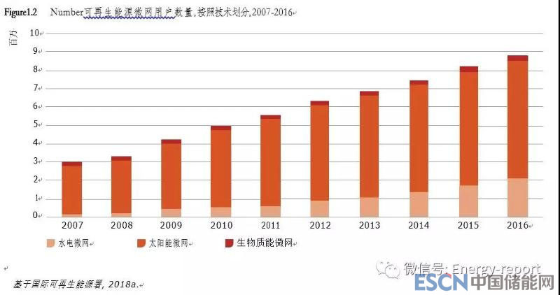 在過去十年中,可再生能源微網的數量穩(wěn)步增長? 小型水電微網是最廣泛應用的,將大多數終端用戶連接到微網中(圖1.2)?由于成本的快速降低和技術的大幅改進,太陽能光伏(PV)最近得到了迅猛增長,從2008年的11兆瓦容量增加到2017年的308兆瓦?