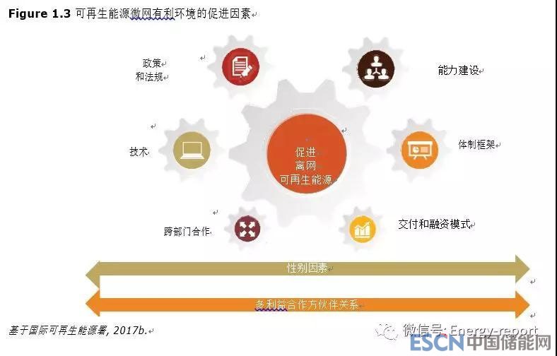 如圖1.3所示,為可再生能源微網建立有利環(huán)境取決于幾個因素? 其中包括政策和法規(guī)?體制框架?交付模式和融資,技術解決方案,能力建設和跨部門合作(國際可再生能源署,2017a)? 其中一些因素相互關聯?