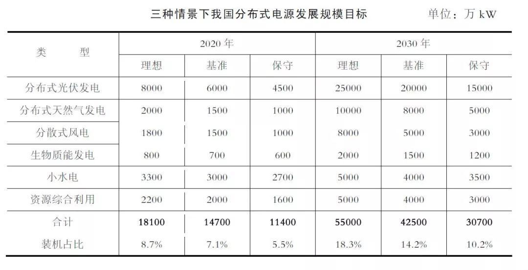根據(jù)國家《能源發(fā)展“十三五”規(guī)劃》《2014—2020 年能源行動(dòng)計(jì)劃》《可再生能源發(fā)展“十三五”規(guī)劃》《電力發(fā)展“十三五”規(guī)劃》相關(guān)內(nèi)容,2020 年分布式光伏發(fā)電、分布式天然氣發(fā)電開發(fā)規(guī)模達(dá)到國家規(guī)劃目標(biāo),2030 年分布式光伏發(fā)電、分布式天然氣發(fā)電開發(fā)規(guī)模應(yīng)滿足實(shí)現(xiàn)國家戰(zhàn)略目標(biāo)的要求;分散式風(fēng)電、生物質(zhì)能發(fā)電、小水電和資源綜合利用開發(fā)規(guī)模達(dá)到相關(guān)規(guī)劃或資源量約束目標(biāo)。