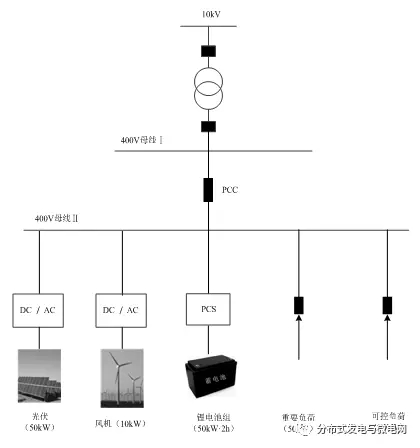 微電網(wǎng)系統(tǒng)由風(fēng)機(jī)、光伏電源、儲(chǔ)能電池、變流器、負(fù)荷、配電網(wǎng)控制系統(tǒng)等組成。發(fā)電側(cè)包含風(fēng)機(jī)、光伏電源、儲(chǔ)能電池等,通過(guò)變流器將微源的輸出轉(zhuǎn)換為滿(mǎn)足并網(wǎng)條件的電能;用電側(cè)根據(jù)負(fù)荷優(yōu)先級(jí)的不同,分為重要負(fù)荷與可控負(fù)荷。