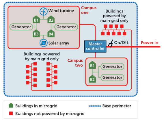 這是使用微電網(wǎng)的典型案例。每個(gè)園區(qū)都有獨(dú)立的電源供應(yīng),兩個(gè)園區(qū)都由一個(gè)主控制器控制,將它們從主電網(wǎng)中分離出來(lái),并在這些電網(wǎng)內(nèi)部或之間直接供電
