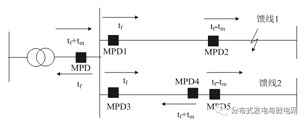 當(dāng)線路的F處出現(xiàn)故障時(shí),保護(hù)設(shè)備MPD、MPD1、MPD2會(huì)同時(shí)檢測(cè)到系統(tǒng)故障,但MPD2會(huì)優(yōu)先動(dòng)作,而后備保護(hù)MPD和MPD1會(huì)根據(jù)需要延時(shí)動(dòng)作。往往微電網(wǎng)的規(guī)模都比較小,沒(méi)有較長(zhǎng)的輸電線路,基本不存在電源通過(guò)一條饋線接入的情況,因此通過(guò)該保護(hù)方案就可以滿足保護(hù)需要[5]。