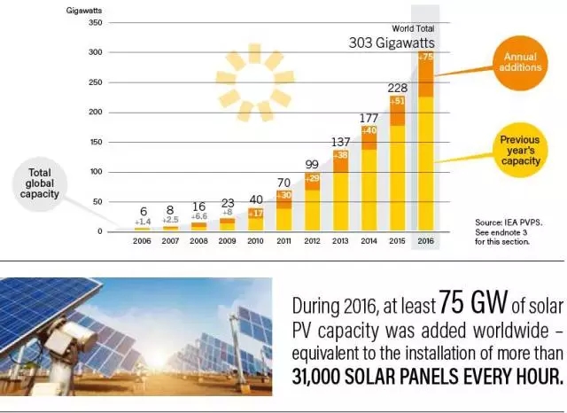 中國(guó)儲(chǔ)能網(wǎng)訊:2016年,全球太陽能光伏發(fā)電裝機(jī)容量至少達(dá)到7500萬千瓦,相當(dāng)于每小時(shí)安裝超過31000個(gè)太陽能電池板。