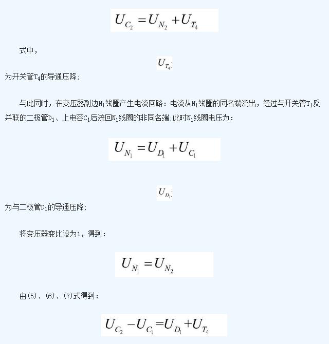 上電容C1的電壓值與下電容C2的電壓值之差為開關(guān)管T1的導(dǎo)通壓降與二極管D4的導(dǎo)通壓降之和;上電容C1在該工作狀態(tài)中不斷放出能量,能量被N1線圈吸收后傳遞給N2線圈,然后由N2線圈通過二極管D4不斷向下電容C2充電;在這個過程中,上電容C1放電,下電容C2充電, 不斷減小, 不斷增加,二者電壓差減少;