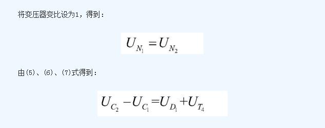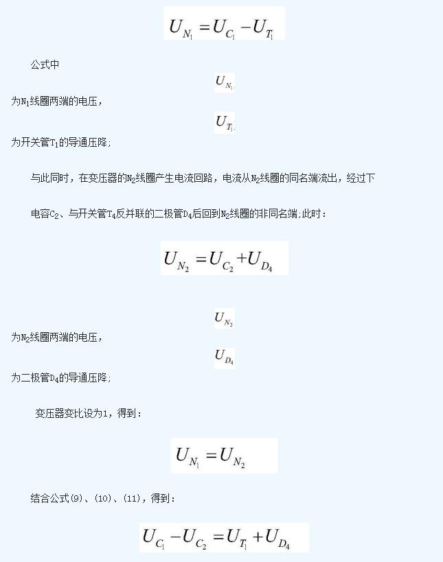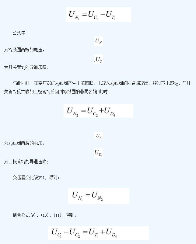 上電容C1電壓與下電容C2電壓之差為二極管D1的導(dǎo)通壓降與開關(guān)管T4導(dǎo)通壓降之和;下電容C2在該工作狀態(tài)中不斷放出能量,能量被N2線圈吸收后傳遞給N1線圈,然后由N1線圈通過二極管D1不斷向上電容C1充電;這個過程中,C2放電,C1充電, 不斷減小, 不斷增加,二者電壓差減少;