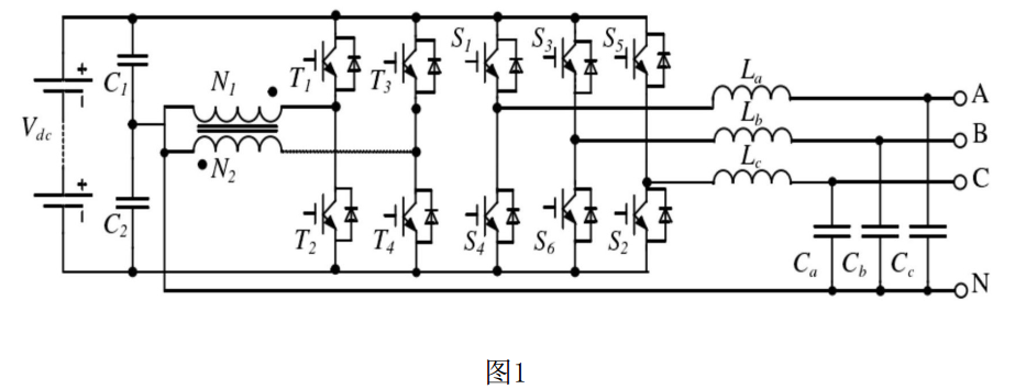 所述三相逆變器電路具備三相的開關(guān)管橋臂,每一相的所述開關(guān)管橋臂在上下臂分別具有開關(guān)管,每一個開關(guān)管反并聯(lián)一個二極管;每一相上臂的開關(guān)管連接到直流電源電路的正極,每一相下臂的開關(guān)管連接到直流電源電路的負極;所述上下臂的開關(guān)管之間的串聯(lián)連接點作為各相的交流輸出端子,分別通過電感La、Lb、Lc連接負載;所述電感La、Lb、Lc分別通過電容Cc、Cb、Ca與中性點N相連,中性點N同時連接到變壓器N1線圈的非同名端和N2線圈的同名端,以及上電容C1與下電容C2的中間連接點。