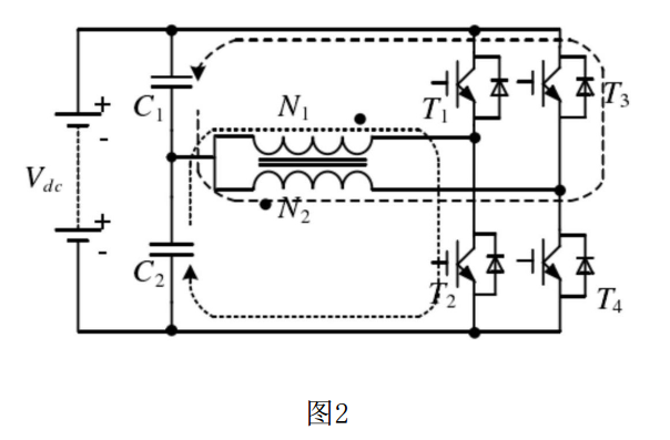 (一)當(dāng)上電容C1上的電容電壓 小于下電容C2上的電容電壓 時,開關(guān)管T2和T4輪流導(dǎo)通,變壓器N1線圈和N2線圈交替作為變壓器原邊,把下電容C2的能量傳遞到上電容C1上,實現(xiàn)上下電容電壓的均衡,開關(guān)管T1和T3一直保持斷開狀態(tài);