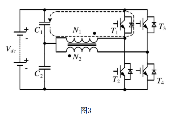 (3)所述③ 狀態(tài)在② 狀態(tài)的續(xù)流完成后開始,此狀態(tài)下,開關(guān)管T4導(dǎo)通,T1、T2、T3關(guān)斷;電流從下電容C2正端流出,經(jīng)過N2線圈、開關(guān)管T4后流回下電容C2的負端,此時: