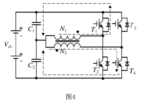 進一步地,當(dāng)上電容C1上的電容電壓 小于下電容C2上的電容電壓 時,開關(guān)管T2和T4輪流導(dǎo)通,變壓器N1線圈和N2線圈交替作為變壓器原邊,把下電容C2的能量傳遞到上電容C1上,實現(xiàn)上下電容電壓的均衡,開關(guān)管T1和T3一直保持斷開狀態(tài);