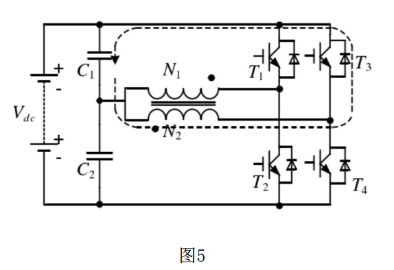 (1)⑤ 狀態(tài)時,開關(guān)管T1導(dǎo)通,T2、T3、T4關(guān)斷;電流從上電容C1的正端流出,經(jīng)過開關(guān)管T1、N1線圈后流回上電容C1的負端;根據(jù)基爾霍夫方程得到: