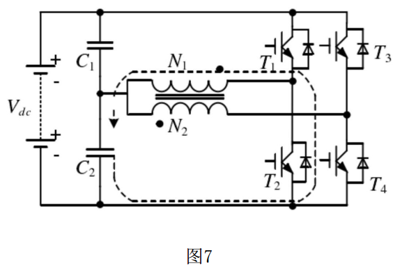 (3)⑦ 狀態(tài)在⑥ 狀態(tài)的續(xù)流完成后開始,該狀態(tài)下開關(guān)管T3導(dǎo)通,T1,T2,T4關(guān)斷,電路中的電流方向如圖8所示。電流從上電容C1正端流出,經(jīng)過開關(guān)管T3、N2線圈后流回上電容C1的負端,此時:
