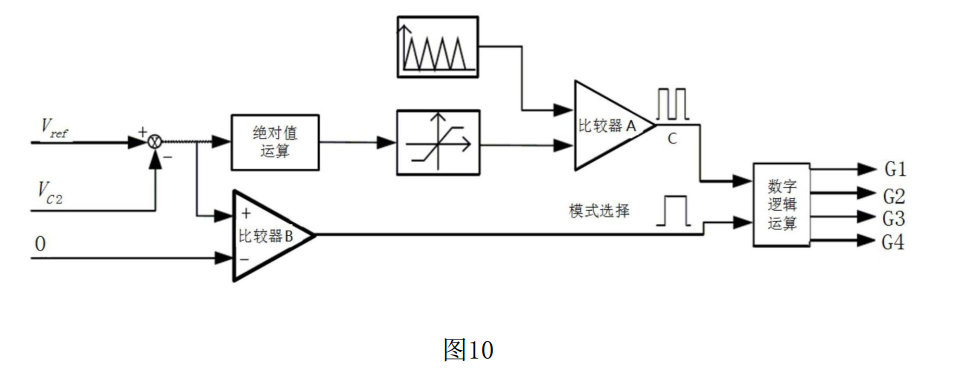 本發(fā)明的網(wǎng)絡(luò)拓撲結(jié)構(gòu)增加了四個開關(guān)管,由電路的模態(tài)分析,通過變壓器的繞組交替作為原邊繞組,最終設(shè)計的控制電路如圖10所示。所述驅(qū)動信號生成模塊包括減法運算單元,絕對值運算單元、限幅單元、三角波載波信號發(fā)生單元、多個比較器、數(shù)字邏輯運算單元、0V電壓給定單元;
