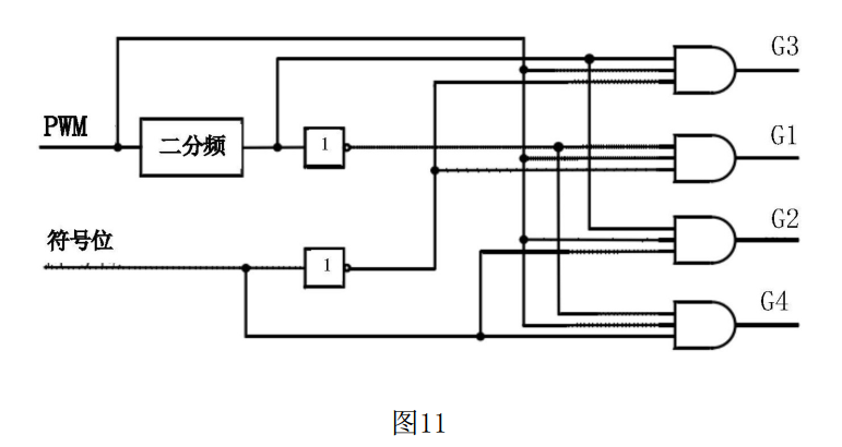 原始PWM信號先通過二分頻,二分頻的輸出及其取反信號用于控制兩個上開關(guān)管還是兩個下開關(guān)管交替導(dǎo)通,符號位及其取反信號用于控制兩個上開關(guān)管的使能還是下開關(guān)管的使能。最終通過四個三輸入與門進行信號的耦合,來分別控制四個開關(guān)管的開通關(guān)斷。