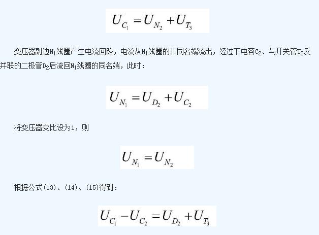 即上電容C1的電壓值與下電容C2的電壓值之差即為開關(guān)管T2的導(dǎo)通壓降與二極管D3的導(dǎo)通壓降之和;下電容C2在該工作狀態(tài)中不斷放出能量,能量被N1線圈吸收后傳遞給N2線圈,然后由N2線圈通過二極管D3不斷向電容上C1充電;這個過程中,C2放電,C1充電, 不斷減小, 不斷增加,二者電壓差減少;