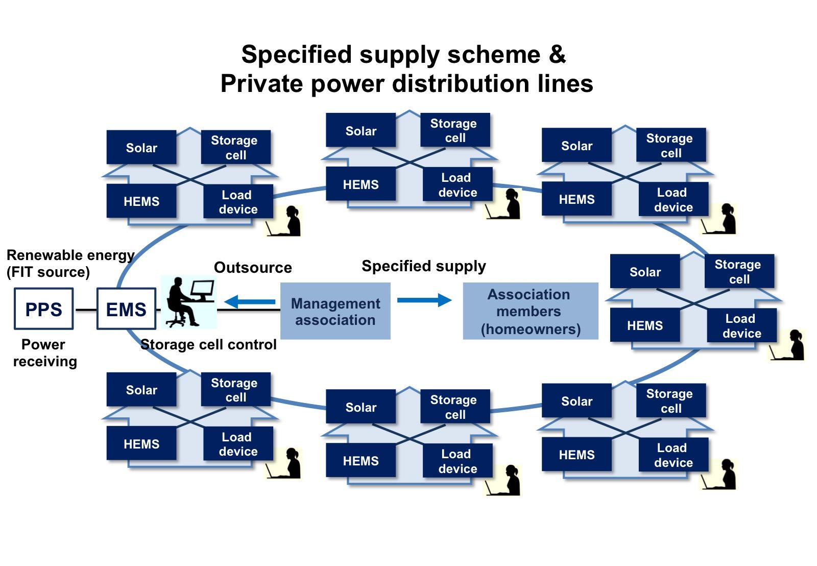 這是由PanaHome、ENERES、興銀租賃和公共事業(yè)局共同開展的項(xiàng)目。項(xiàng)目概念是打造“通過生活能源相互聯(lián)系的城鎮(zhèn)”。PanaHome購(gòu)買了由公共事業(yè)局開發(fā)的土地。松下公司和蘆屋市也參與配合該項(xiàng)目開發(fā)。構(gòu)建日本首個(gè)(*2)微電網(wǎng)系統(tǒng)是該項(xiàng)目的一部分。太陽(yáng)能將用于為這一整個(gè)住宅區(qū)域提供80%或以上的電力(*3)。通過專用配電線(*4)向住宅區(qū)域供電以及在家庭用戶之間共享電力讓上述情況變得切實(shí)可行。即使該地區(qū)在緊急情況期間與傳統(tǒng)電網(wǎng)斷開連接時(shí),專用配電線也可通過特定電路繼續(xù)供電。專用配電線使得通電和靈活設(shè)置電價(jià)變?yōu)榭赡堋R虼?,這將為屋主帶來諸多益處,包括減少20%的電費(fèi)。另一個(gè)關(guān)鍵目標(biāo)是對(duì)環(huán)境有所貢獻(xiàn),主要是盡量利用可再生能源來減少二氧化碳排放。展望未來,該項(xiàng)目將有助于催生樓宇間共享電力的解決方案,從而防止電網(wǎng)相對(duì)薄弱的外部地區(qū)以及在外部展示這些解決方案時(shí)斷電。