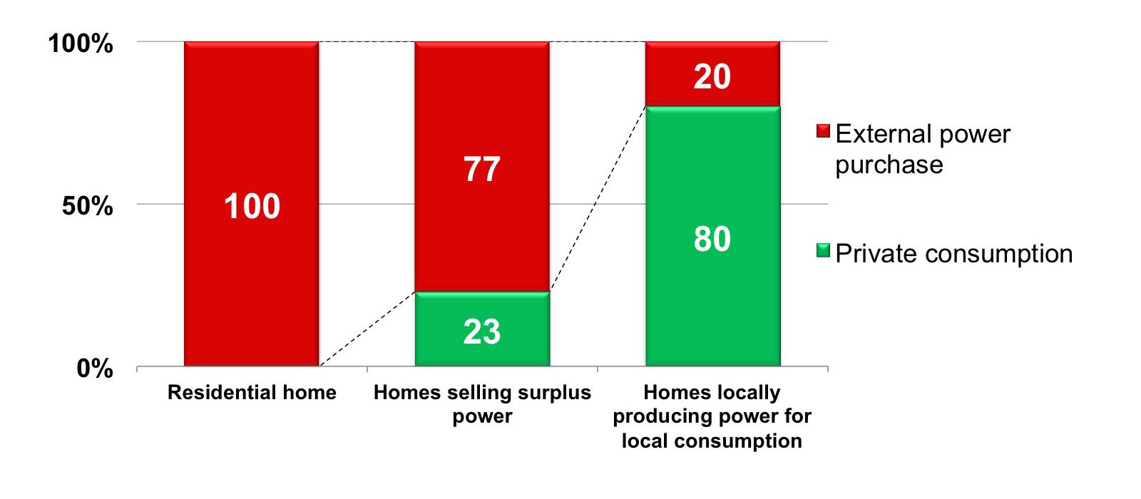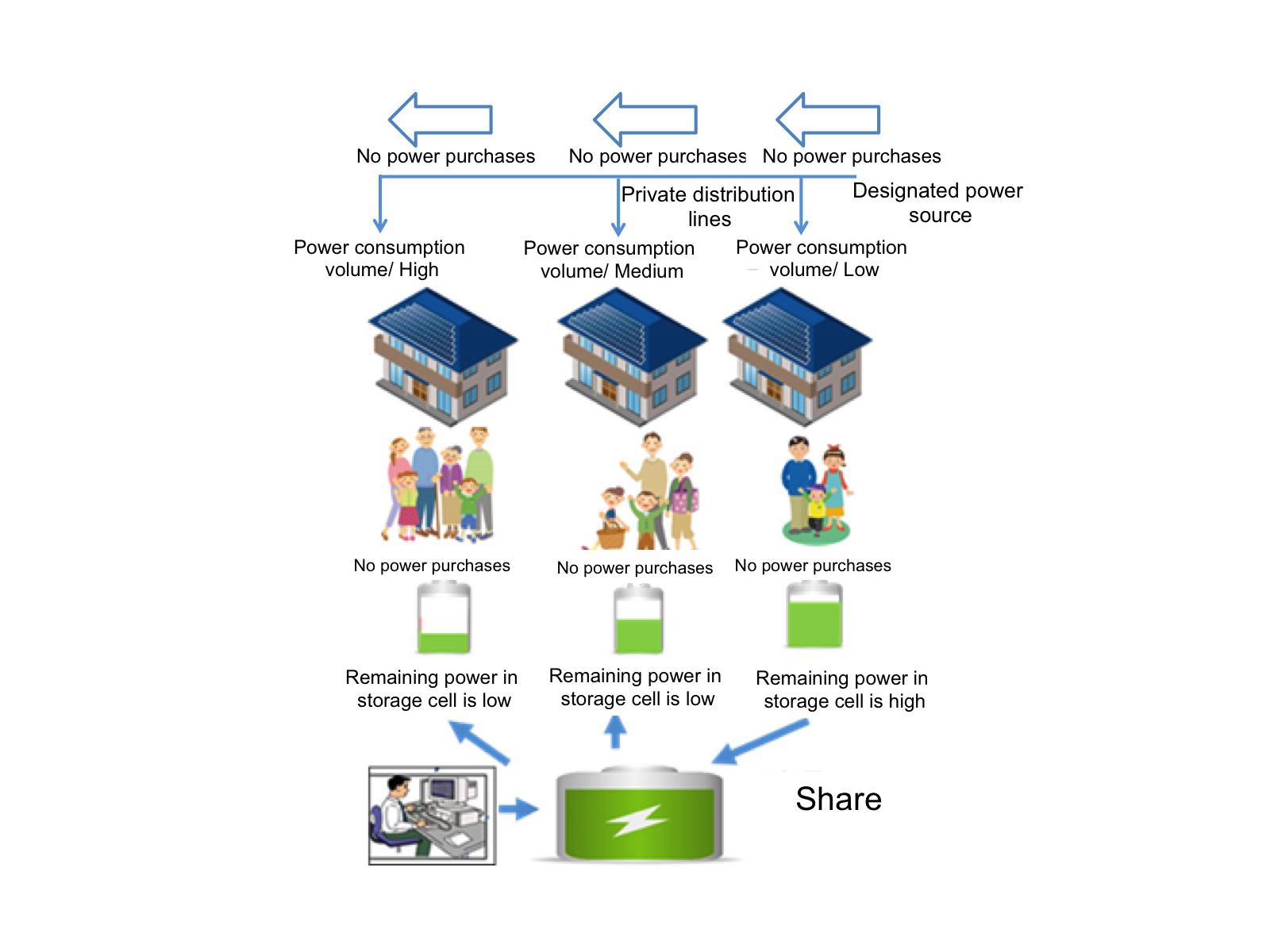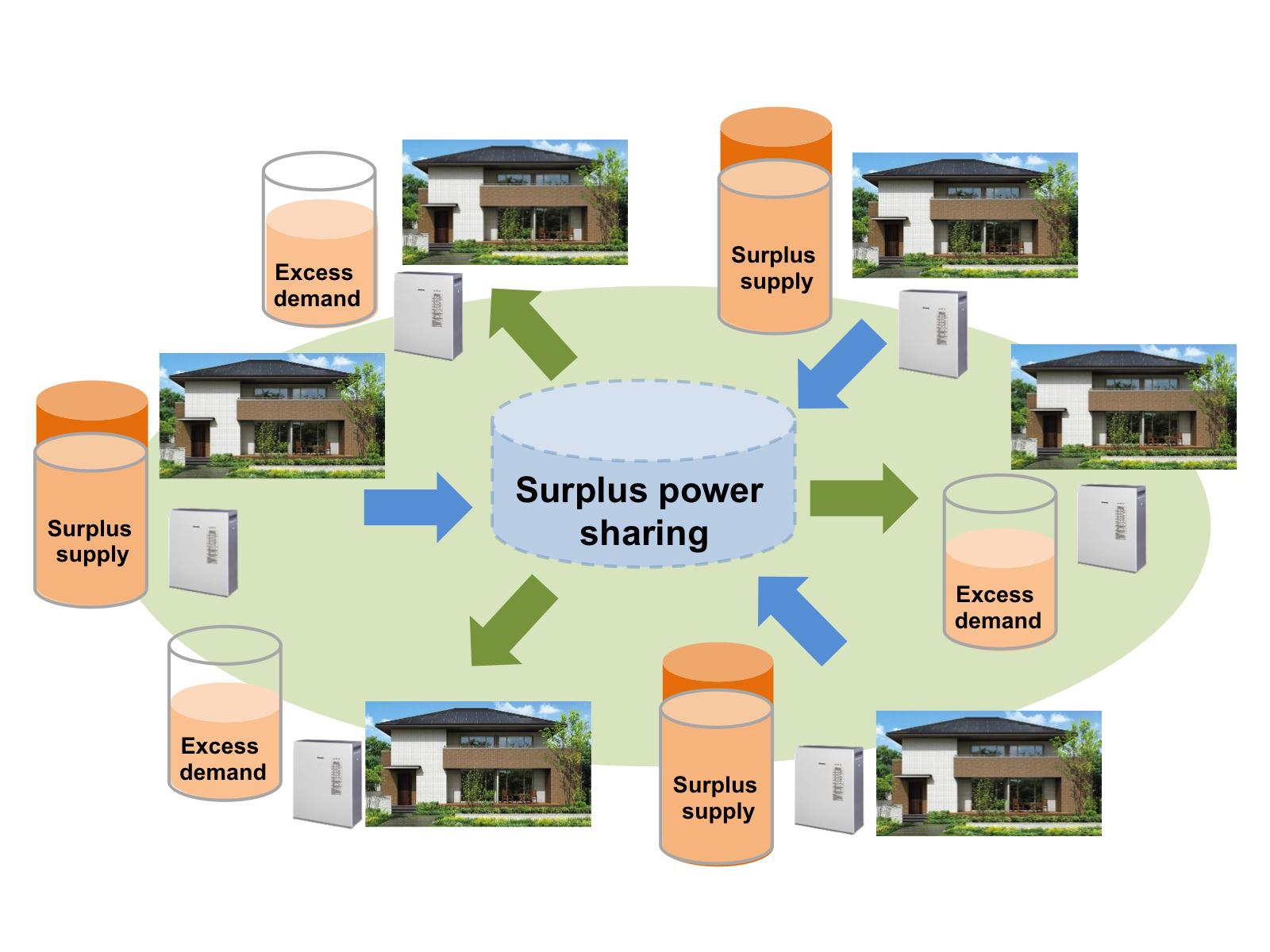 在該項(xiàng)目中,所有家庭均安裝了太陽(yáng)能發(fā)電機(jī)、蓄電池和HEMS。安裝在每戶家庭中的蓄電池相互連接形成網(wǎng)絡(luò)。儲(chǔ)存在蓄電池中的電力(11.2千瓦時(shí))可由該區(qū)的117戶家庭共享。它就像一個(gè)擁有1.3兆瓦時(shí)電力的巨型蓄電池。電力過剩的家庭可與電力緊缺的家庭共享。此舉將無需從外部購(gòu)買電能,并能夠盡量利用該地區(qū)內(nèi)的太陽(yáng)能發(fā)電。
