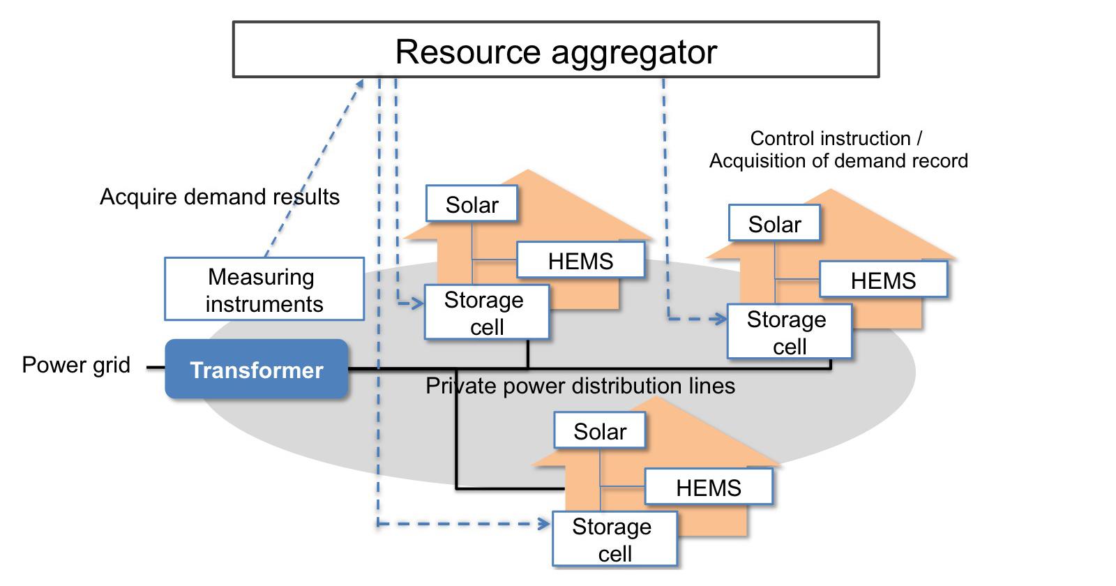 除了部署微電網(wǎng)之外,還將對(duì)VPP控制單元進(jìn)行可行性測(cè)試。當(dāng)資源聚合商(*13)自上而下發(fā)出需量反應(yīng)(*12)命令等指令時(shí),目標(biāo)是控制每戶家庭中蓄電池的電力流入和流出,以解決該區(qū)域電力消費(fèi)的增加或減少問題,就像一臺(tái)發(fā)電機(jī)提供所有功能一樣。