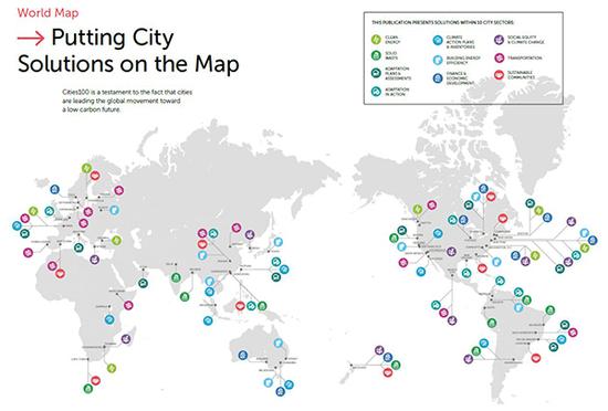 100城項(xiàng)目分布圖。本文圖片除特殊標(biāo)注外均來(lái)自:100 solutions for climate action in cities