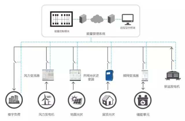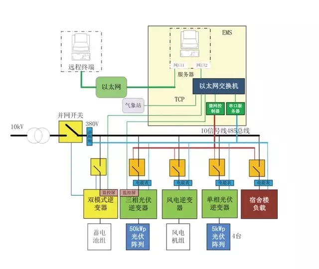 為了實(shí)現(xiàn)多種電力和能源的有效匹配及運(yùn)行效益最大化,微網(wǎng)系統(tǒng)需要能量管理系統(tǒng)(EMS)對系統(tǒng)運(yùn)行進(jìn)行監(jiān)視和管理,例如通過EMS進(jìn)行分布式電源能量調(diào)度、儲能系統(tǒng)管理、負(fù)荷能效分析、并網(wǎng)/孤島模式自動(dòng)切換、系統(tǒng)地潮流穩(wěn)定控制等。