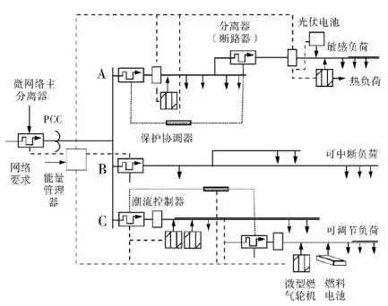 與大部分微電網(wǎng)一樣,該微電網(wǎng)內(nèi)含有多種微電源形式。為充分利用能量,在可以產(chǎn)生熱量的微電源附近安裝有熱力驅(qū)動的負(fù)荷。微網(wǎng)中還配備了保護(hù)協(xié)調(diào)器和潮流控制器,以實(shí)現(xiàn)對微電網(wǎng)系統(tǒng)的保護(hù)和有效控制。與其他微網(wǎng)不同,該微電網(wǎng)結(jié)構(gòu)依據(jù)供電質(zhì)量的要求不同,把負(fù)荷分為三類,即敏感負(fù)荷、可調(diào)節(jié)負(fù)荷、可中斷負(fù)荷,再對各類負(fù)荷進(jìn)行不同優(yōu)先級的管理[2]。