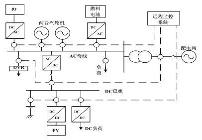 不同于美國與歐洲各國,日本面積狹小,資源匱乏,這種嚴(yán)峻的能源形式與其快速發(fā)展的經(jīng)濟(jì)現(xiàn)狀之間顯得極不協(xié)調(diào)。對能源的渴求使得其發(fā)展理念更側(cè)重于儲能和多樣化地利用能源。以日本三菱為代表的微網(wǎng)研究機(jī)構(gòu)給出的定義為:微電網(wǎng)是一種包含電源和熱能設(shè)備以及負(fù)荷的小型可控系統(tǒng),其可作為一個整體單元接入主網(wǎng)運(yùn)行,并且將以傳統(tǒng)電源供電的獨(dú)立電力系統(tǒng)歸入微電網(wǎng)研究范疇,大大擴(kuò)展了CERTS對微電網(wǎng)的定義范圍。圖3為日本提出的典型微網(wǎng)結(jié)構(gòu)。