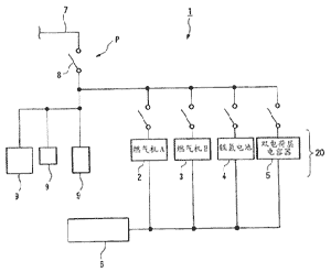 1.微電網(wǎng)系統(tǒng);2.燃?xì)鈾C(jī)(gas engine)A(電源);3.燃?xì)鈾C(jī)B(電源);4.鎳氫電池(電源);5.雙電荷層電容器(電源);6.控制部件;7.商用系統(tǒng);8.設(shè)置開(kāi)關(guān);9.負(fù)荷;10.各個(gè)分布式電源。