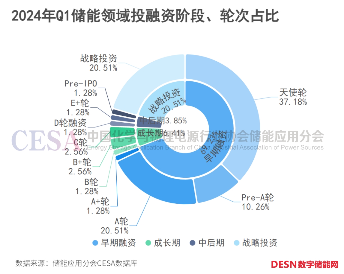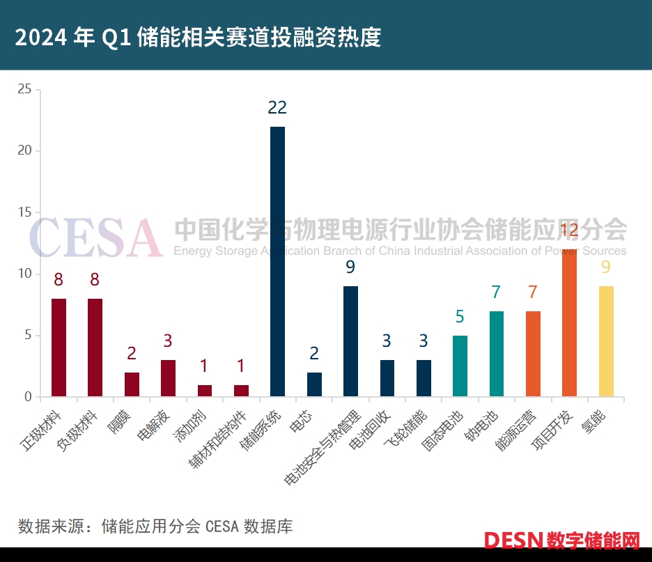 據(jù)CESA儲(chǔ)能應(yīng)用分會(huì)、中國(guó)儲(chǔ)能網(wǎng)不完全統(tǒng)計(jì),從儲(chǔ)能賽道分析,儲(chǔ)能系統(tǒng)集成以23起融資事件,成為2024年Q1的最熱門(mén)賽道,融資金額超21億。新能源與儲(chǔ)能項(xiàng)目開(kāi)發(fā)次之。