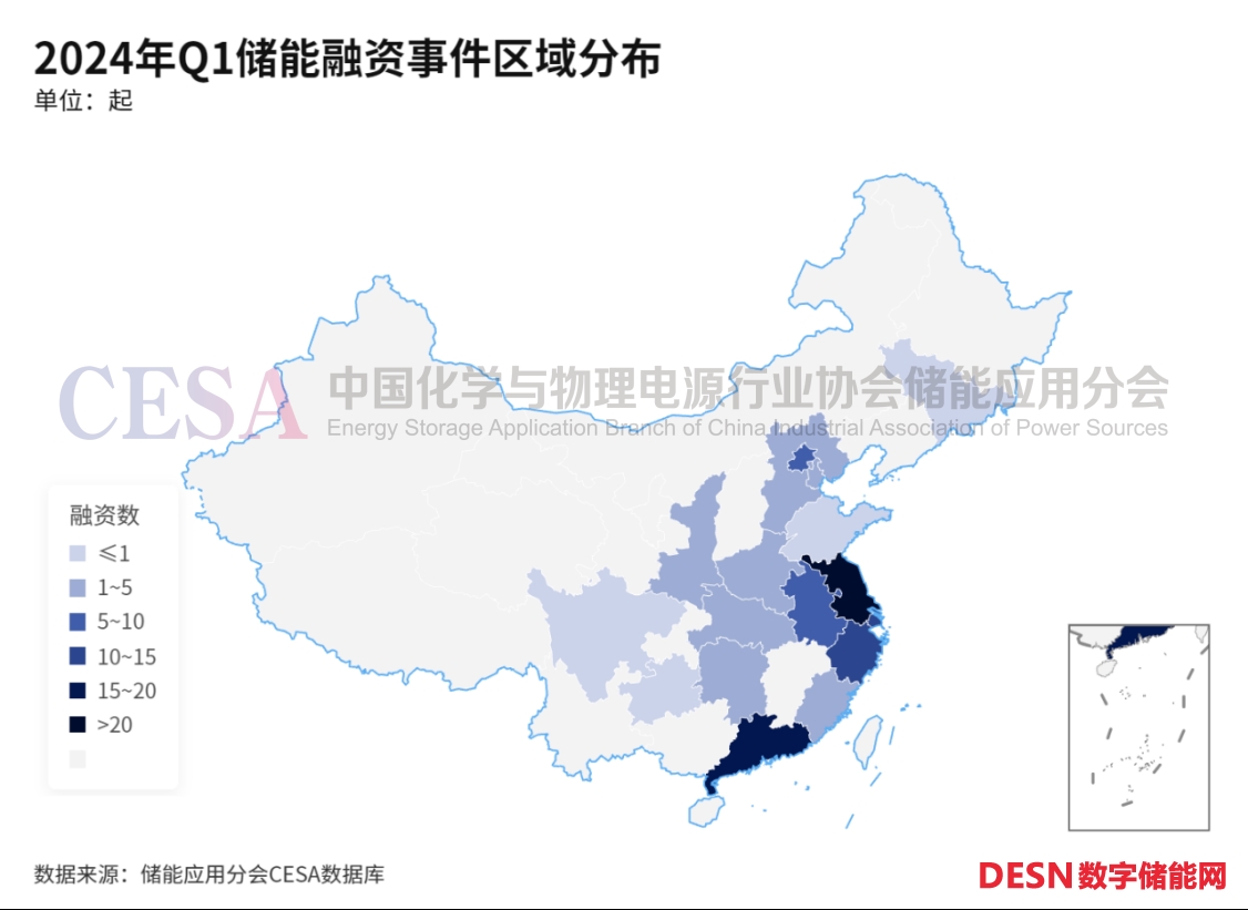 據(jù)CESA儲(chǔ)能應(yīng)用分會(huì)、中國(guó)儲(chǔ)能網(wǎng)不完全統(tǒng)計(jì),2024年Q1一級(jí)市場(chǎng)儲(chǔ)能融資事件主要分布在東部沿海地區(qū),江蘇省是儲(chǔ)能相關(guān)公司最多且融資最為活躍的地方,融資金額超16億,共有23家儲(chǔ)能相關(guān)公司進(jìn)行了融資,數(shù)量占比22.55%。