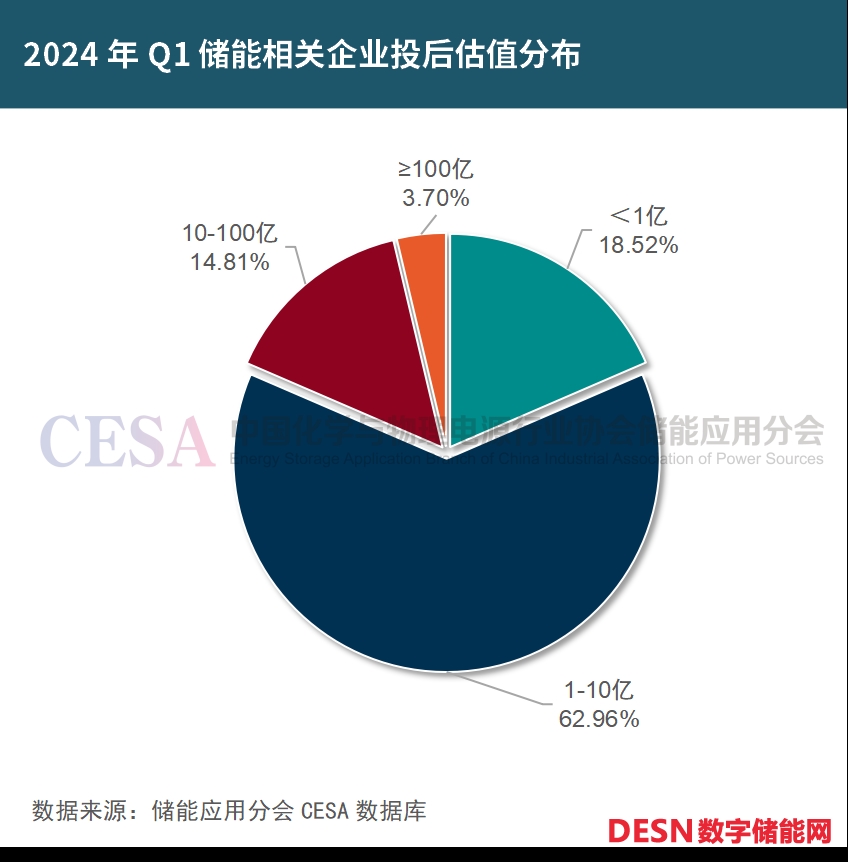 據(jù)CESA儲(chǔ)能應(yīng)用分會(huì)、中國(guó)儲(chǔ)能網(wǎng)不完全統(tǒng)計(jì),2024年Q1融資的100家儲(chǔ)能相關(guān)公司中,有53家披露了最新輪次融資的估值。投后估值小于1億的公司有10家,占比18.52%。在1億-10億區(qū)間內(nèi)的公司數(shù)量最多,有34家,占比62.96%。10億-100億區(qū)間的公司有8家,占比14.81%。投后估值大于100億的為兩家,占比3.7%。