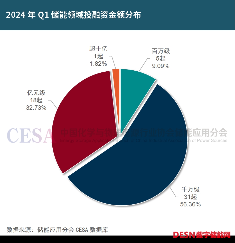 據(jù)CESA儲(chǔ)能應(yīng)用分會(huì)、中國(guó)儲(chǔ)能網(wǎng)不完全統(tǒng)計(jì),就融資額分析,2024年Q1有近半數(shù)融資事件未披露具體金額,在已披露融資金額的55起事件中,有31起是千萬(wàn)元級(jí)融資,占比56.36%,億元級(jí)的發(fā)生了18起,占比32.73%,此外還有1起十億元級(jí)投資。億元級(jí)融投資主要集中在儲(chǔ)能系統(tǒng)集成和項(xiàng)目開(kāi)發(fā)領(lǐng)域。
