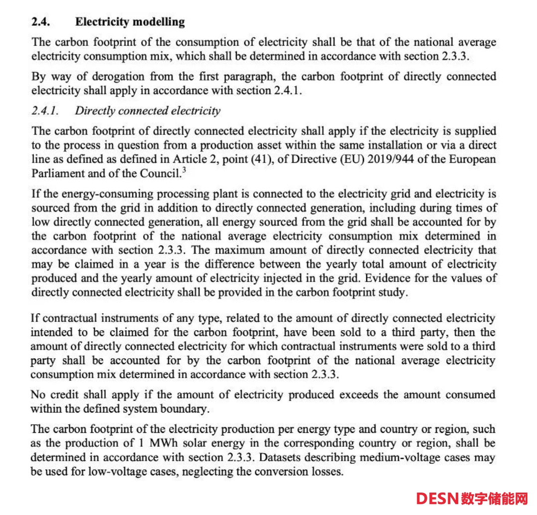 多位業(yè)內(nèi)人士告訴《南方能源觀察》(以下簡(jiǎn)稱“eo”),規(guī)則草案附件中的“2.4.電力建?!保‥lectricity modelling)章節(jié)明確,計(jì)算電動(dòng)車電池電力消費(fèi)碳足跡時(shí)默認(rèn)基于“國家平均電力消費(fèi)組合”(national average electricity consumption mix),電力直連的情況例外。原文表述見下圖: