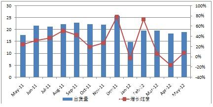 第二個原因,由于三元材料的電壓平臺低,使得鎳鈷錳鋰電池大部分在筆記本電腦中使用,少部分用在手機(jī)中。根據(jù)高工鋰電產(chǎn)業(yè)研究所(GBII)數(shù)據(jù)整理顯示,2012年1~5月份我國筆記本電腦出貨量為9171萬臺,同比增長7.90%,2011年同期出貨量增長速度為17.68%;特別是剔除春節(jié)因素后的3月份同比增長5.67%,4月份同比下滑16.27%,5月份同比增長7.85%(圖3)。筆記本電腦產(chǎn)量增長速度的大幅下降,自然而然會壓制三元材料產(chǎn)量的增長。