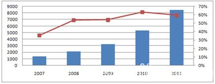 圖1:2007年~2011年中國三元材料產(chǎn)量統(tǒng)計(噸)
