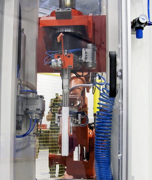 陶瓷材料被壓入磨具成型。圖中后方可見(jiàn)操作這一過(guò)程的橙色機(jī)器人,它們正將壓制好的材料從模具中移走。