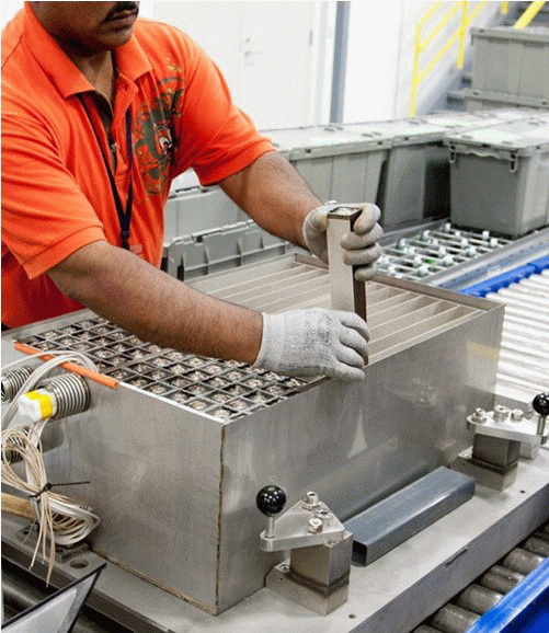 一名工人正將電池組插入封裝外殼,電池中包含有用于控制電池的微處理器,以及讓電池在其適應(yīng)的約300℃工作的加熱器。