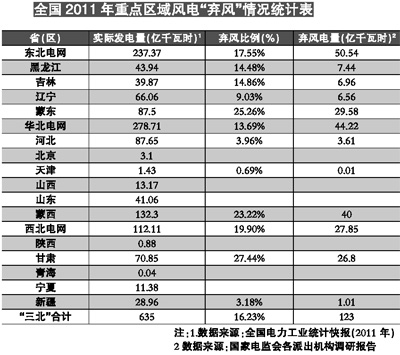 “三北”地區(qū)包括國家規(guī)劃的6個以陸地風電為主的千萬千瓦級風電基地,并網(wǎng)風電裝機占全國并網(wǎng)風電裝機比重達87.7%。2011年,全國風電發(fā)電量為731.74億千瓦時,其中“三北”地區(qū)風電發(fā)電量為635.37億千瓦時,占比為86.8%。但2011年,“三北”地區(qū)風電場平均利用小時數(shù)1907小時,同比降低266小時;棄風電量達123億千瓦時,棄風率約16%,電費損失約66億元。