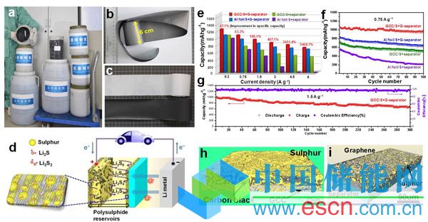 圖1 a:大量制備的石墨烯原料;b:連續(xù)石墨烯集流體;c:涂覆有石墨烯的連續(xù)隔膜;d:三明治鋰硫正極結(jié)構(gòu)的示意圖;不同電池構(gòu)造的鋰硫電池的e:倍率性能;f-g:循環(huán)穩(wěn)定性;h-i:三維X射線成像分析硫在硫正極及石墨烯復合隔膜中的分布
