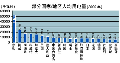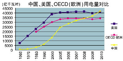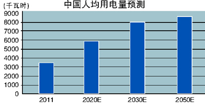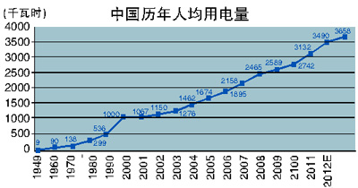 2011年,我國(guó)全社會(huì)用電量4.7萬(wàn)億度,超過美國(guó),排名世界第一。2011年,我國(guó)人均用電量3490度,比世界平均水平高約450度,排名世界第五十五位左右。過去十年,我國(guó)人均用電量?jī)粼?340度。