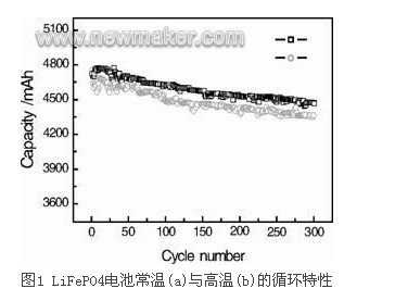 為了考察LiFePO4電池在不同溫度下的循環(huán)性能,對實(shí)驗(yàn)電池做了常溫及高溫循環(huán)性能測試。測試結(jié)果對比曲線如圖1,可以看出,常溫循環(huán)性能略優(yōu)于高溫循環(huán)性能。常溫循環(huán)300次時(shí)的放電容量4469.6mAh,容量保持率達(dá)94.63%。高溫循環(huán)300次時(shí)的放電容量4366.1mAh,容量保持率為91.81%。電池的高溫循環(huán)性能較為優(yōu)異,這可能是由于在高溫循環(huán)時(shí),Li+在較高的溫度下具有較大的擴(kuò)散活化能,電池中的電化學(xué)反應(yīng)阻抗減小,致使Li+在正負(fù)極之間嵌入和脫出的阻力明顯降低[6, 7],并且LiFePO4在較高的溫度下具有良好的穩(wěn)定性[8]。