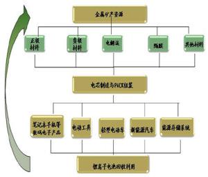 鋰離子電池上游是金屬礦產(chǎn)資源,下游為各種數(shù)碼產(chǎn)品、電動工具以及電動汽車行業(yè)。除此之外,一個完整的鋰離子電池產(chǎn)業(yè)鏈還應(yīng)包括鋰離子電池的回收利用。