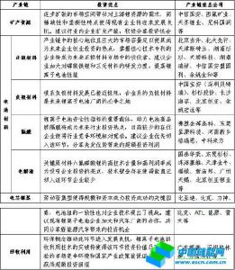 上游礦產(chǎn)資源環(huán)節(jié):隨著鋰離子電池行業(yè)的快速發(fā)展,下游產(chǎn)能擴張,資源類企業(yè)供貨壓力不斷增大,需求增速大于供給增速的趨勢將使得上游礦產(chǎn)資環(huán)節(jié)投資價值凸現(xiàn)。但是,由于礦產(chǎn)資源的稀缺性以及企業(yè)的壟斷性再加上該類行業(yè)一般前期投入資本較大等特點,一般中小企業(yè)很難切入其中。建議行業(yè)內(nèi)企業(yè)積極通過上市、并購、引入戰(zhàn)略投資者等多種資本運作手段,積極擴大產(chǎn)能,做大做強,分享行業(yè)成長所帶來的投資收益。事實上,尼科國潤在2007年成功的引入了摩根士丹利、德同4000萬美元的戰(zhàn)略投資;天齊鋰業(yè)和贛鋒鋰業(yè)也分別于2010年3月和2010年4月公布了招股說明書,積極準(zhǔn)備上市融資。