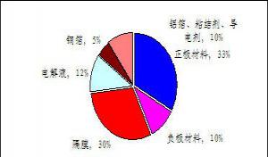 鋰離子電池材料主要包括正極材料、負極材料、隔離膜、電解液四個部分,其他還有鋁鉑、銅箔、粘結(jié)劑等。其中正極材料占全部成本的33%左右,負極材料占比較低,為10%;電解液和隔膜分別占成本的12%和30%左右。