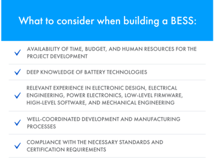 BESS manufacturers offer a wealth of options with various storage capacities and for any application and budget. However, purchasing an off-the-shelf system demands strong knowledge of the technology, and a ready-made BESS may not meet the specific requirements of an end user.