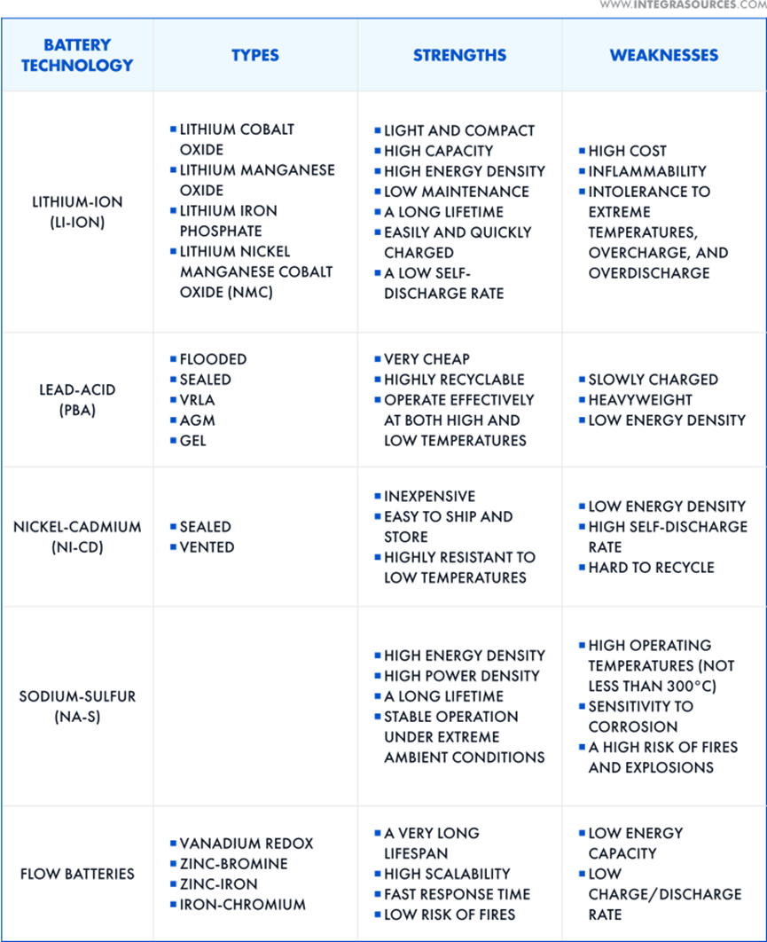 According to the 2020 report prepared by the US Energy Information Administration (EIA), over 90% of a large-scale battery energy storage system in the USA were powered by lithium-ion batteries. The current global statistics are pretty much the same. This type of rechargeable battery is widely popular in electric vehicles, consumer electronics, and portables, such as smartphones, laptops, tablets, and cameras. Li-ion battery chemistries comprise lithium cobalt oxide, lithium manganese oxide, lithium iron phosphate, lithium nickel manganese cobalt oxide (NMC), and others. The advantages of a Li-ion battery make it one of the leading technologies facilitating the storage of energy. The global lithium-ion battery market is projected to double by 2026, reaching $91.9 billion. It’s light and compact, has high capacity and energy density, low maintenance, and a long lifetime. In addition, lithium-ion batteries are easily and quickly charged and have a low self-discharge rate. The weak points of this battery technology include high cost, inflammability, and intolerance to extreme temperatures, over-charge, and over-discharge.