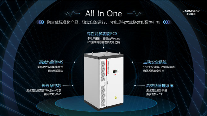 技術(shù)是推動(dòng)儲(chǔ)能行業(yè)發(fā)展的核心動(dòng)力,是化解儲(chǔ)能行業(yè)面臨的成本、壽命、安全等難點(diǎn)痛點(diǎn)問題的終極手段,對(duì)于行業(yè)集中式、集散式系統(tǒng)方案面臨的安全性和經(jīng)濟(jì)性關(guān)鍵問題,奇點(diǎn)在行業(yè)內(nèi)首次提出并采用“All in One”的設(shè)計(jì)理念,將長壽命電芯,電池管理系統(tǒng)BMS、高性能變流系統(tǒng)PCS、主動(dòng)安全系統(tǒng)和高效熱管理系統(tǒng)融于單個(gè)機(jī)柜,形成一體化即插即用的智慧能量塊產(chǎn)品eBlock。每個(gè)能量塊都具備能量存儲(chǔ)和交直流功率變換的能力,并可通過多機(jī)并聯(lián)實(shí)現(xiàn)儲(chǔ)能電站的彈性擴(kuò)容和積木式搭建,定義了儲(chǔ)能系統(tǒng)集成新標(biāo)準(zhǔn)。